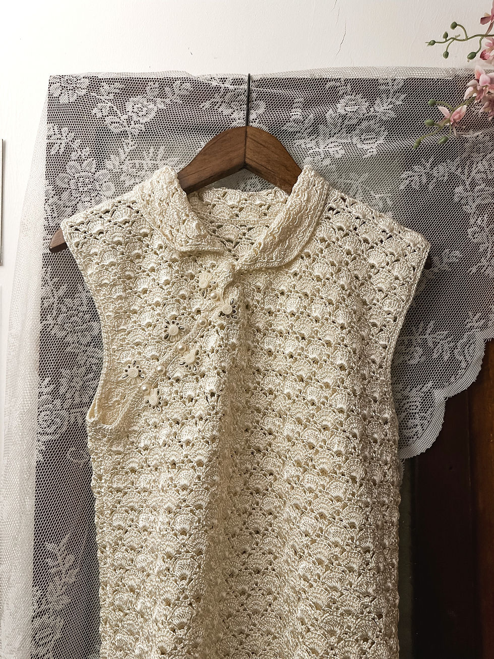 米白人手鈎針旗袍上衣
